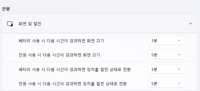 절전모드 진입을 차단하기 위해 윈도우 절전 설정에서 아래 시간 설정 '안 함'설정하게 됩니다.